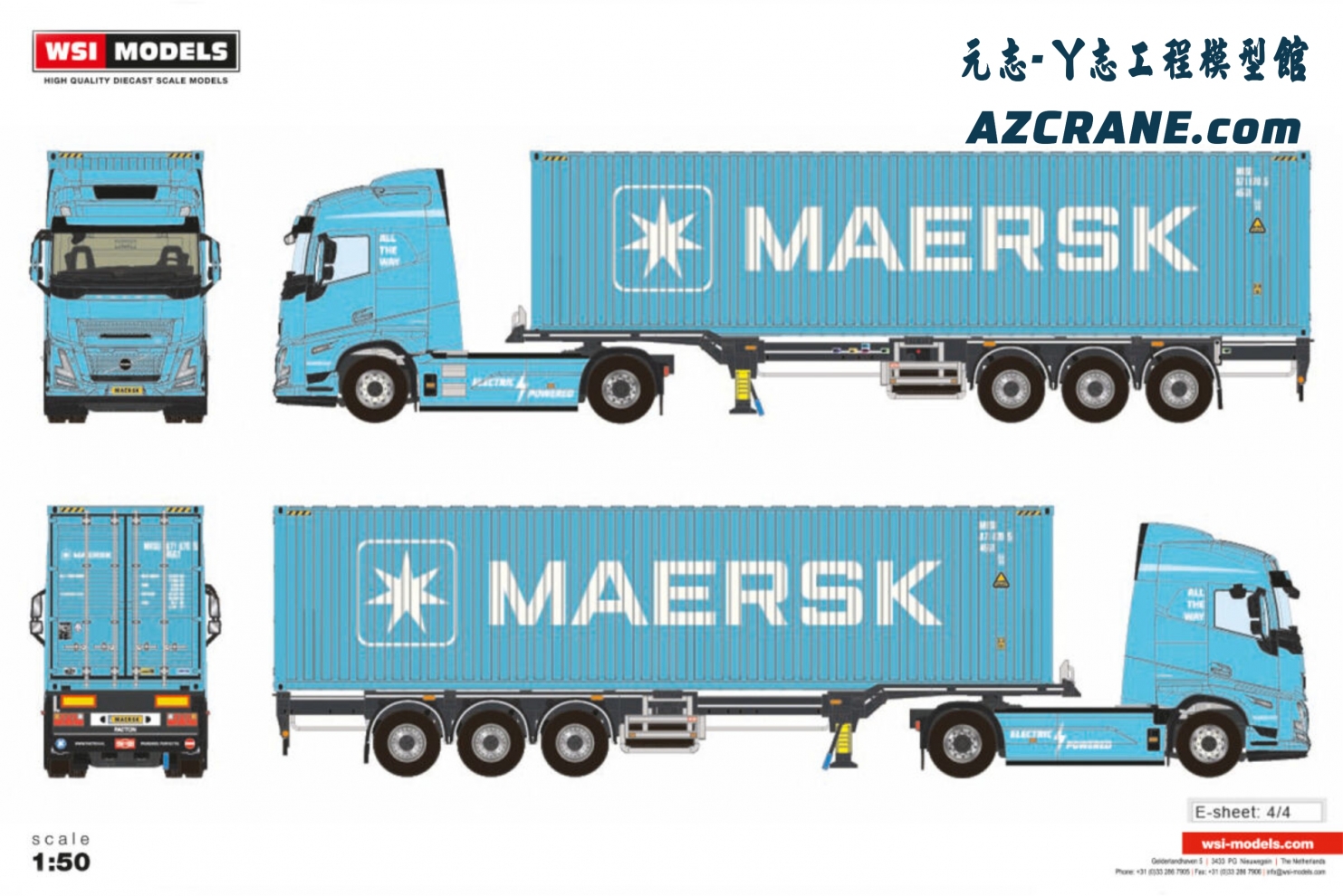 WSI 04-2264 VOLVO FH AERO GLOBETROTTER ELECTRIC 4X2 FLEX CONTAINER TRAILER - 3 AXLE + 40FT CONTAINER HQ MAERSK Premium Line